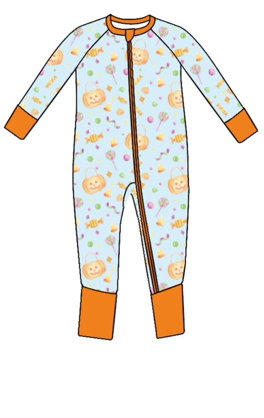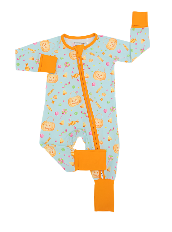 Our custom printed Trick Or Treat print brings excitement to children as they count down to Halloween night! Featured in our premium bamboo, your little one will be kept both comfortable and cool, as this fabric is buttery-soft, breathable, and moisture wicking. We have even designed details with mom and dad in mind such as double zippers for easier diaper changes, fold over mittens (up to size 3-6 months), and fold over feet to offer more versatility. A win for both baby and parents!