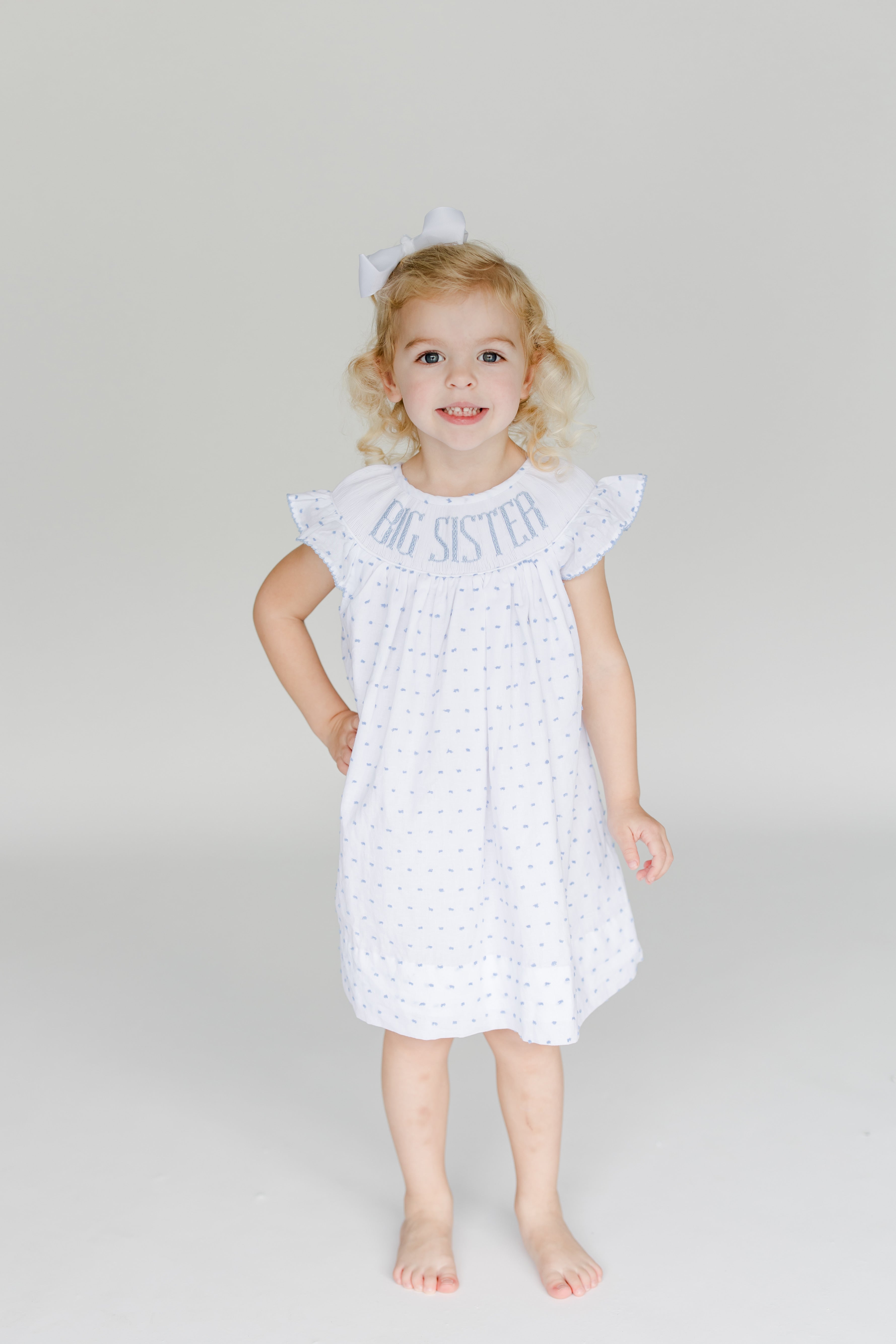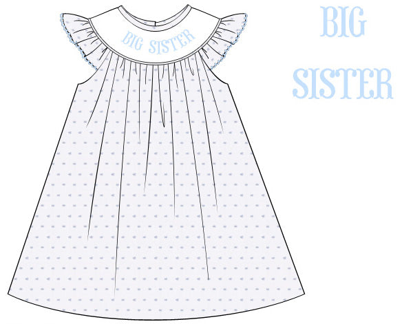 Our hand smocked Big Sister dress is perfect for pregnancy announcements, gender reveals, a gift for the new big sister, and for every day life! This dress has a white background with blue swiss dot details.