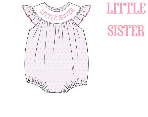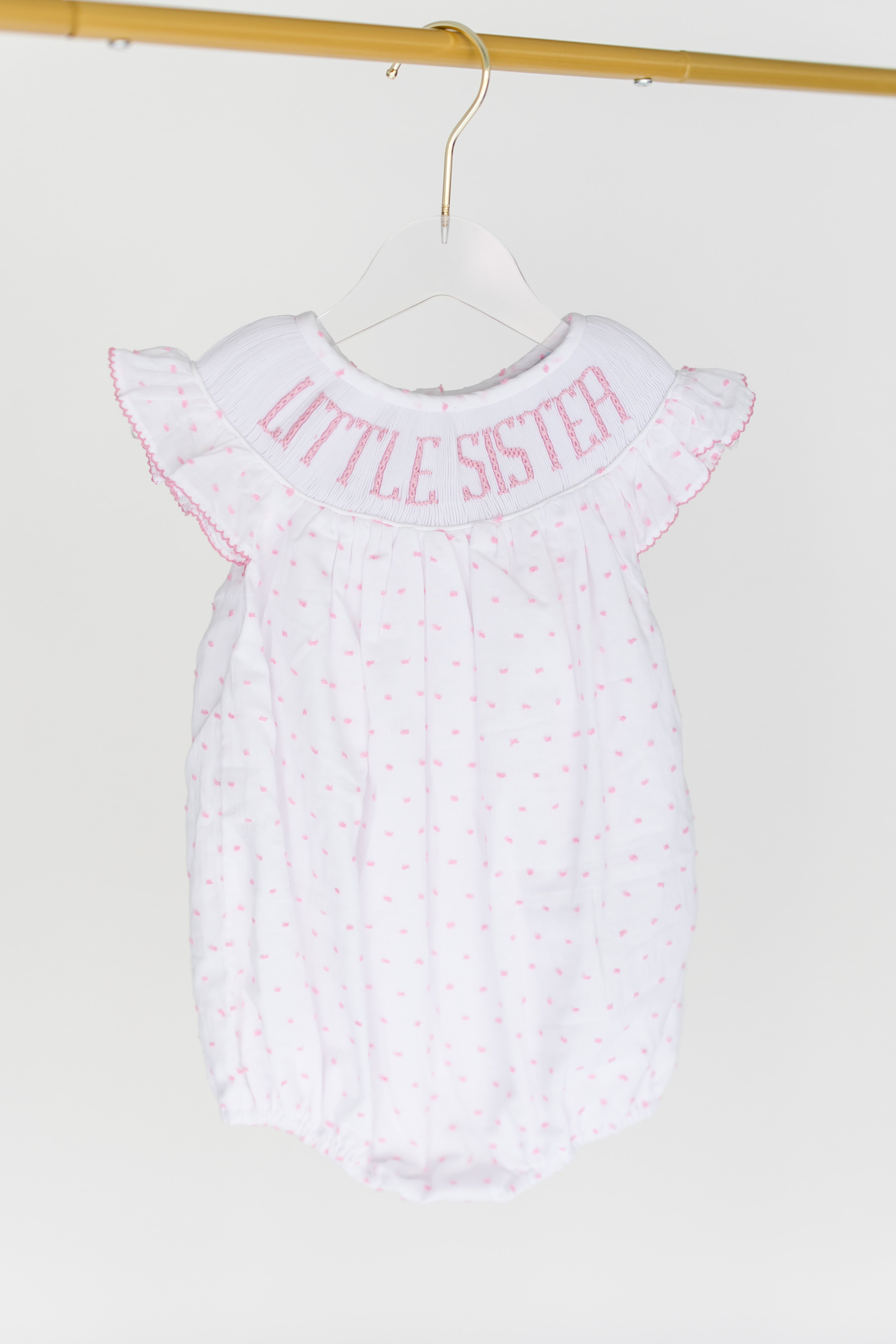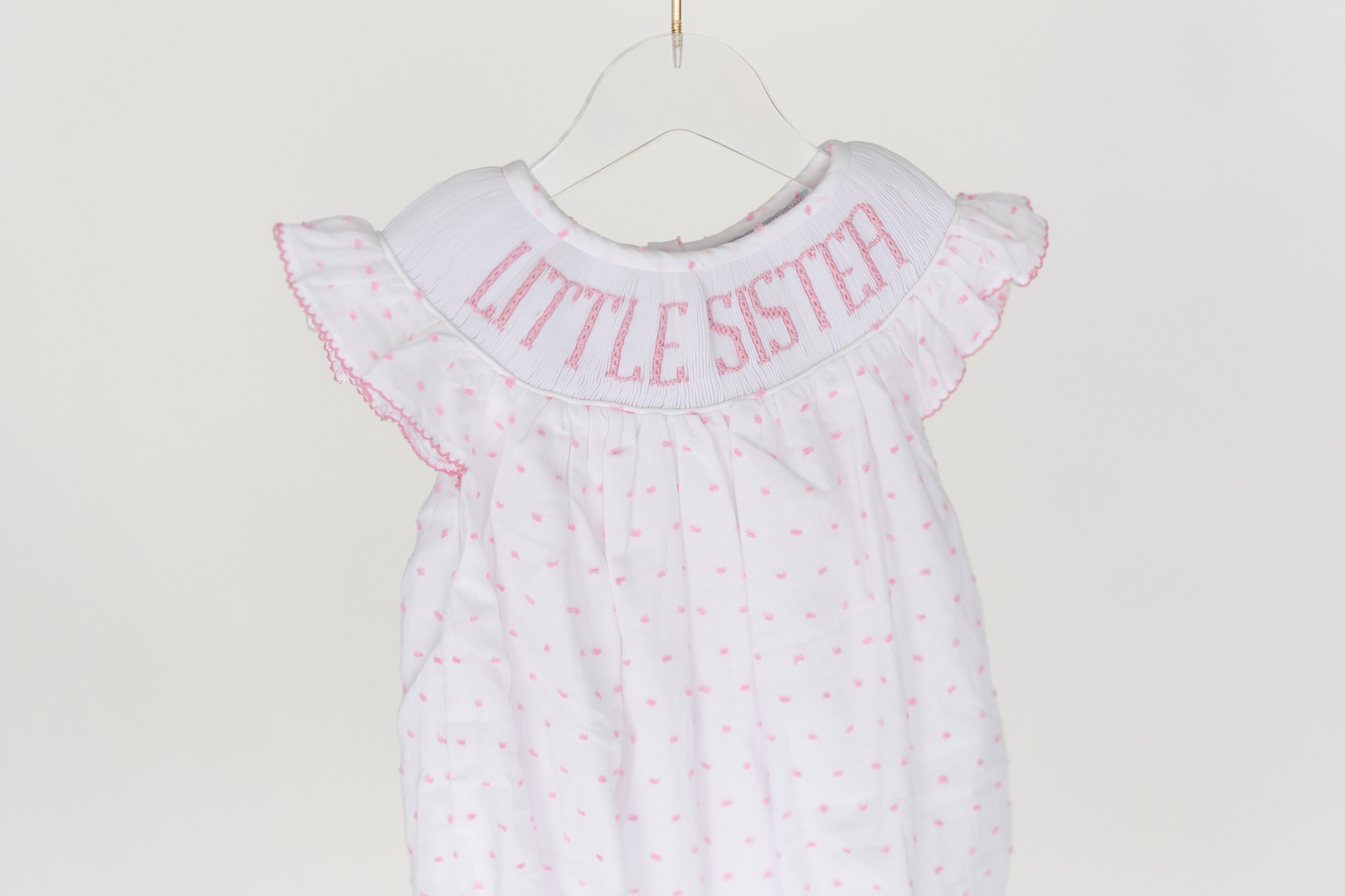 Our hand smocked little sister bubble is perfect for pregnancy announcements, gender reveals, a gift for the little sister, and for every day life! This bubble is double lined with a white background with pink swiss dot details.