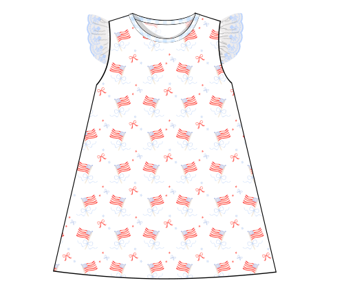 This comfy t-shirt dress is featured in our custom Flags and Bows print with blue and white eyelet flutter sleeves